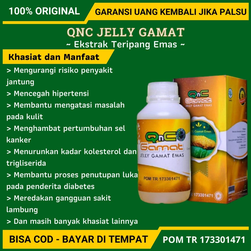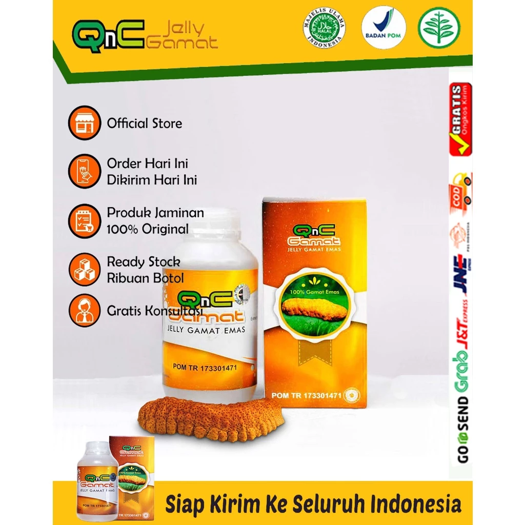 QnC Jelly Gamat merupakan produk terbaru yang diolah dari 100% ekstrak gamat asli murni, dan diolah menggunakan teknology modern dengan metode khusus, natural extracing yang menjamin kealamian dan kehigienisan produk. QnC jelly gamat yang satu ini sangat berbeda dari produk gamat lainnya, dan dipastikan mempunyai khasiat dan kualitas yang paling unggul. Kualitas produk bisa terlihat saat anda mencampurkan QnC jelly gamat ke dalam air, tidak akan langsung menyatu, karena kentalnya jelly gamat ini (ekstrak gamat 100%). Berbeda dengan produk lainnya yang saat dicampur dengan air langsung menyatu (ekstrak gamat tersebut diolah dengan tambahan air).