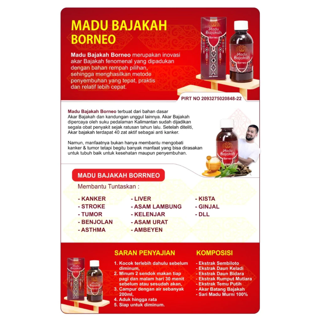 Madu Bajakah Borneo yang telah diformulasikan dengan herbal pilihan lainnya seperti sambiloto, temu putih, daun bidara, rumput Mutiara, keladi tikus, dan madu menjadikannya lebih maksimal dalam memperoleh khasiat nyatanya. Madu Bajakah Borneo juga memiliki Teuku Wisnu sebagai brand ambassadornya.