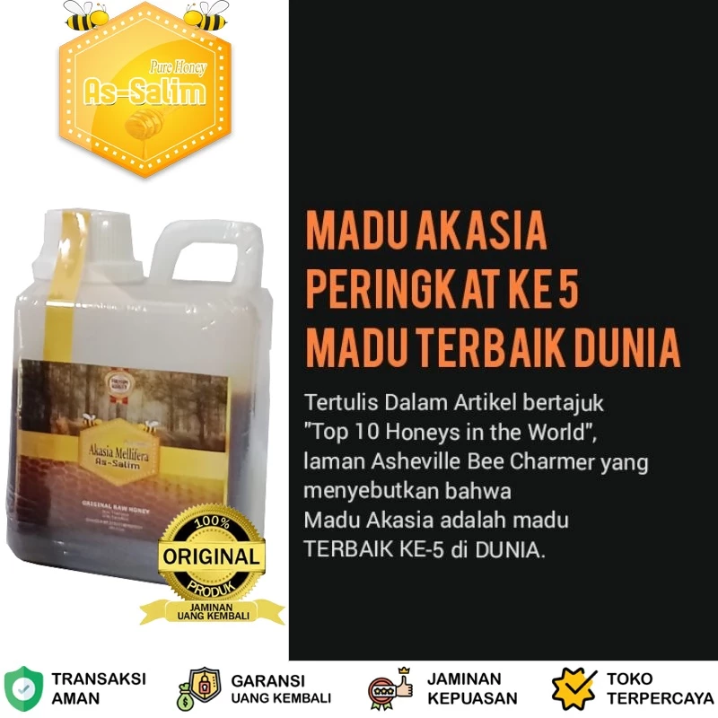 AS-SALIM HONEY sangat murni dan fresh tanpa campuran zat lain dengan kualitas terbaik karena langsung dari petani indonesia yang teredukasi dalam menangani proses ternak lebah.Tersebar dari berbagai petani indonesia dilahan yang kaya akan nektar bunga. Panen secara berkala menjadikannya selalu fresh saat sampai ke tangan pembeli, tanpa melalui proses pemanasan atau pengentalan karena proses tersebut dapat merusak kualitas madu dan hilang unsur-unsur penting pada madu seperti enzim diastase, vitamin, dan propolis.