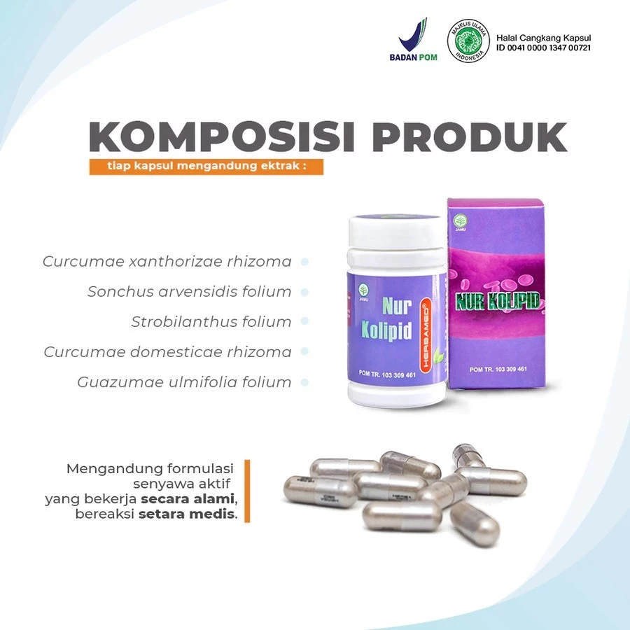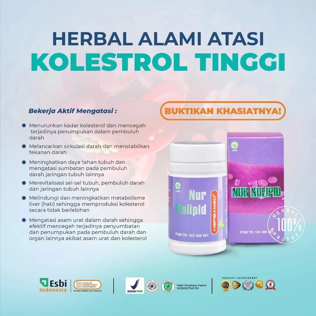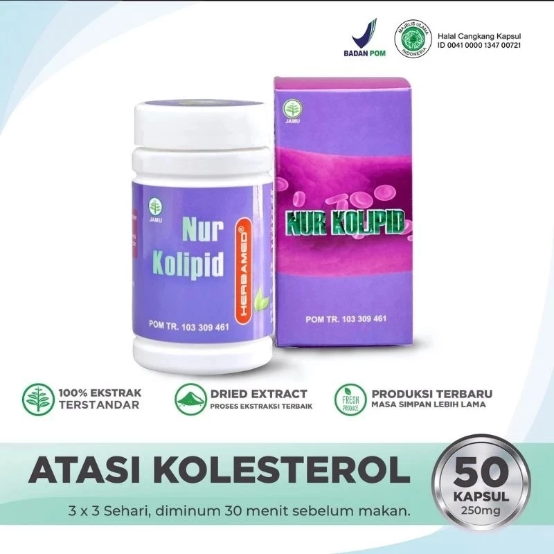 Herbamed Nur Kolipid adalah obat herbal untuk menurunkan kadar kolesterol, trigliserida dan lemak darah, menjaga kesehatan jantung dan meningkatkan daya tahan tubuh.