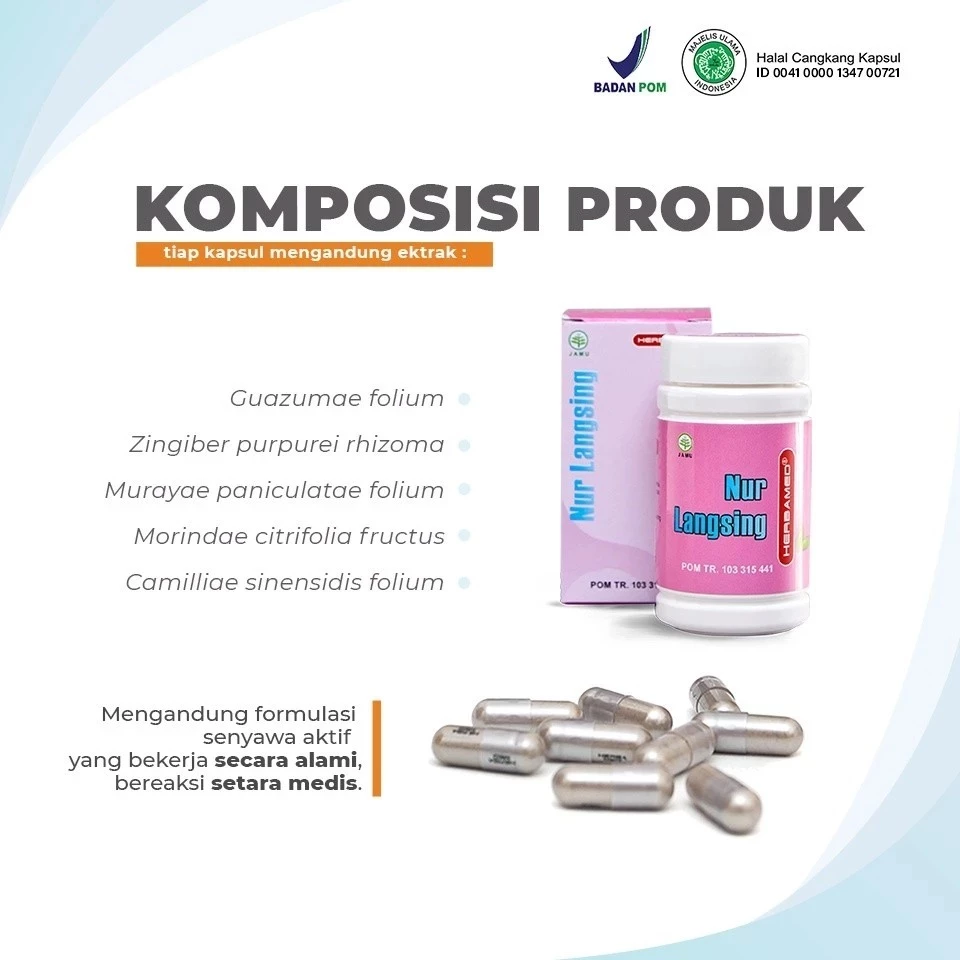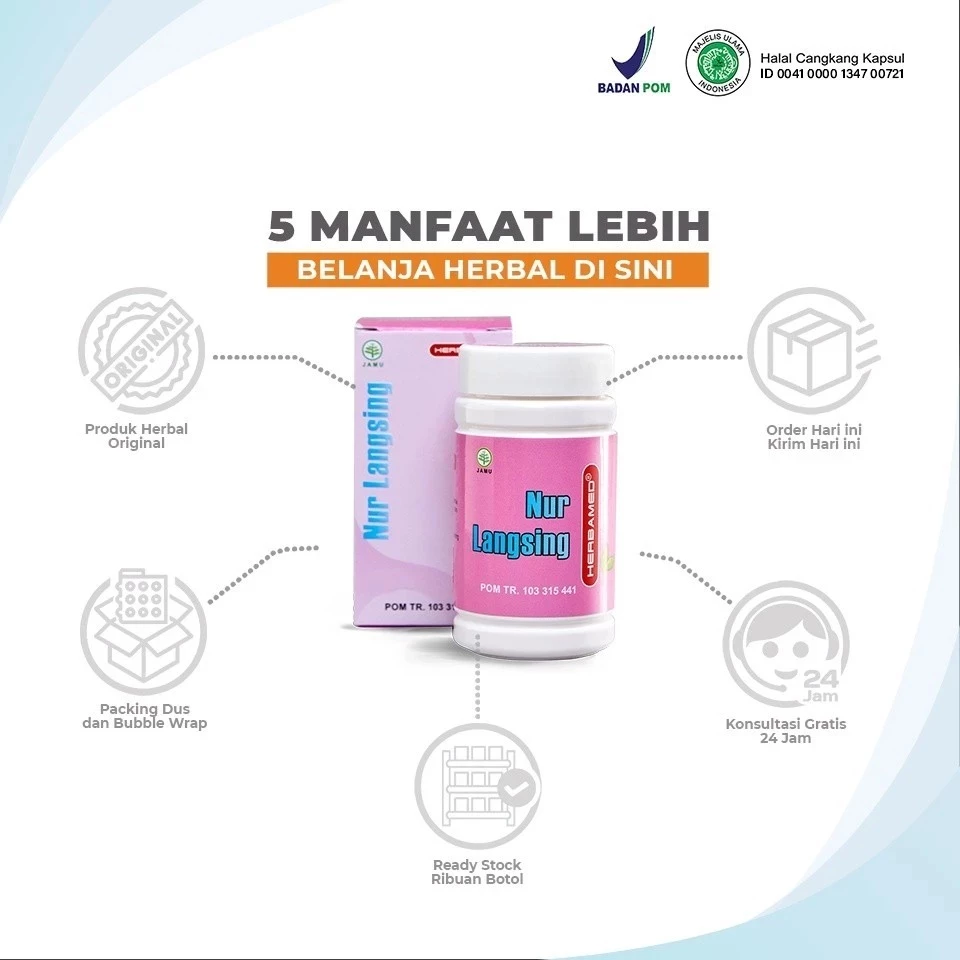 NUR LANGSING adalah herbal untuk melangsingkan tubuh serta membantu menurunkan berat badan dan membentuk tubuh secara alamiah tanpa menimbulkan efek samping serta meningkatkan daya tahan dan stamina tubuh. Seperti yang sudah kita ketahui bahwa kegemukan berhubungan langsung dengan kesehatan tubuh secara keseluruhan dan berpotensi mengundang munculnya beragam penyakit dan komplikasi serta menghambat peremajaan sel. Salah satu upaya untuk mendapatkan kesehatan tubuh yang prima dan mencegah munculnya berbagai penyakit kronis sekaligus memiliki tubuh ideal adalah dengan menurunkan kegemukan.
