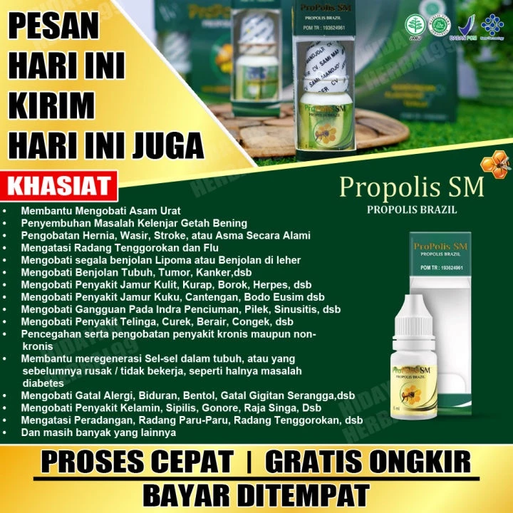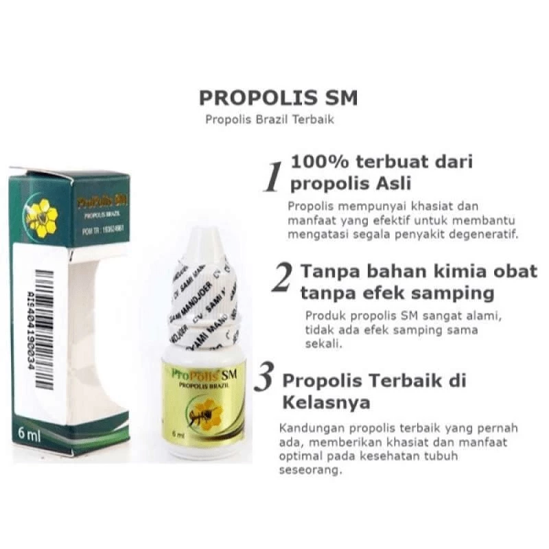 PROPOLIS SM adalah kemasan terbaru dari Propilis Brazil yang di produksi oleh CV SAMI MANDJOER YOGYAKARTA. Propolis SMS ini terbuat dari 100% propolis bazil asli kualitas premium, dengan rasio 7:1 tanpa campuran alkohol dan bahan lainnya. Serta diolah secara canggih dengan teknologi nano, sehingga khasiatnya lebih cepat dan efektif dirasakan dibandingkan dengan produk serupa lainnya.