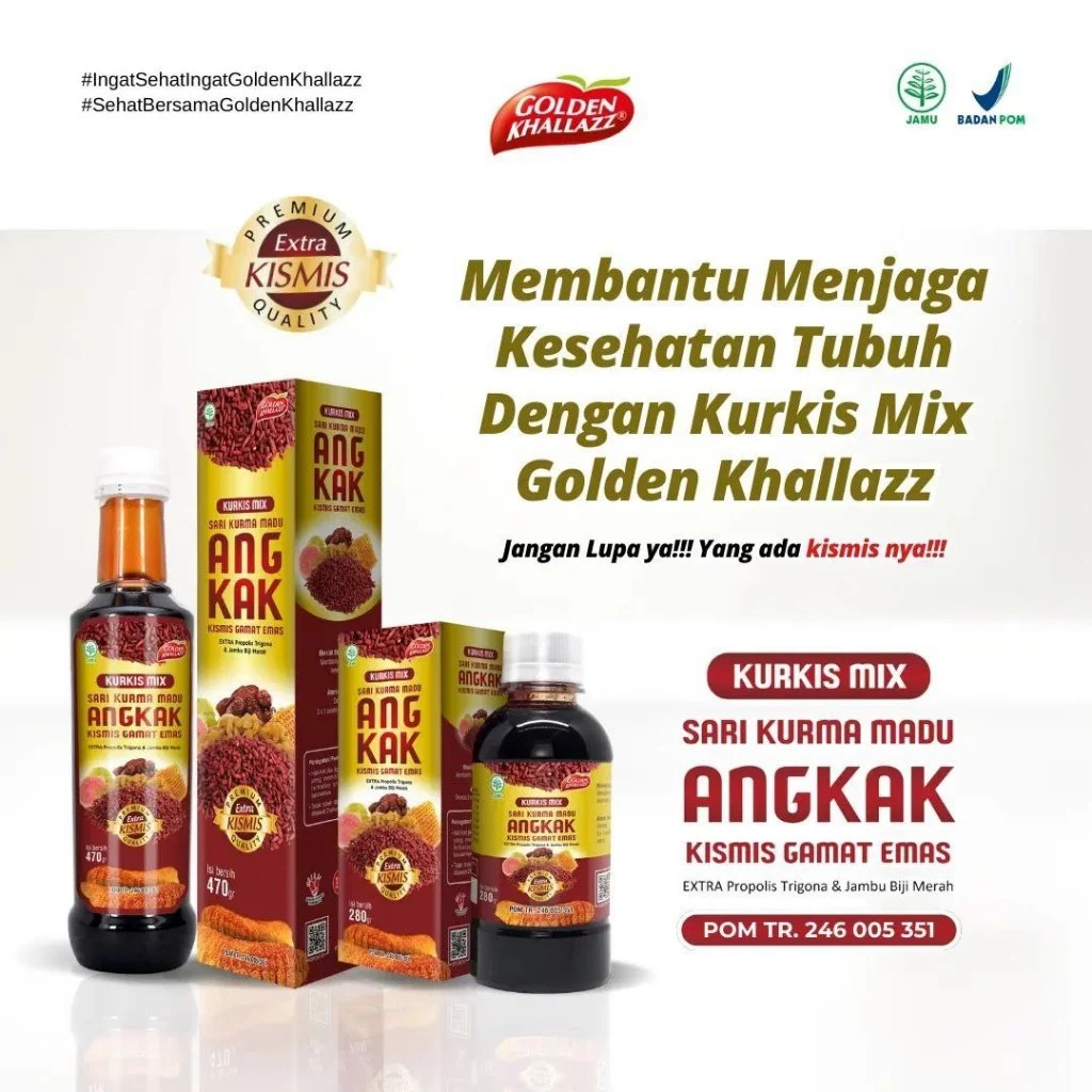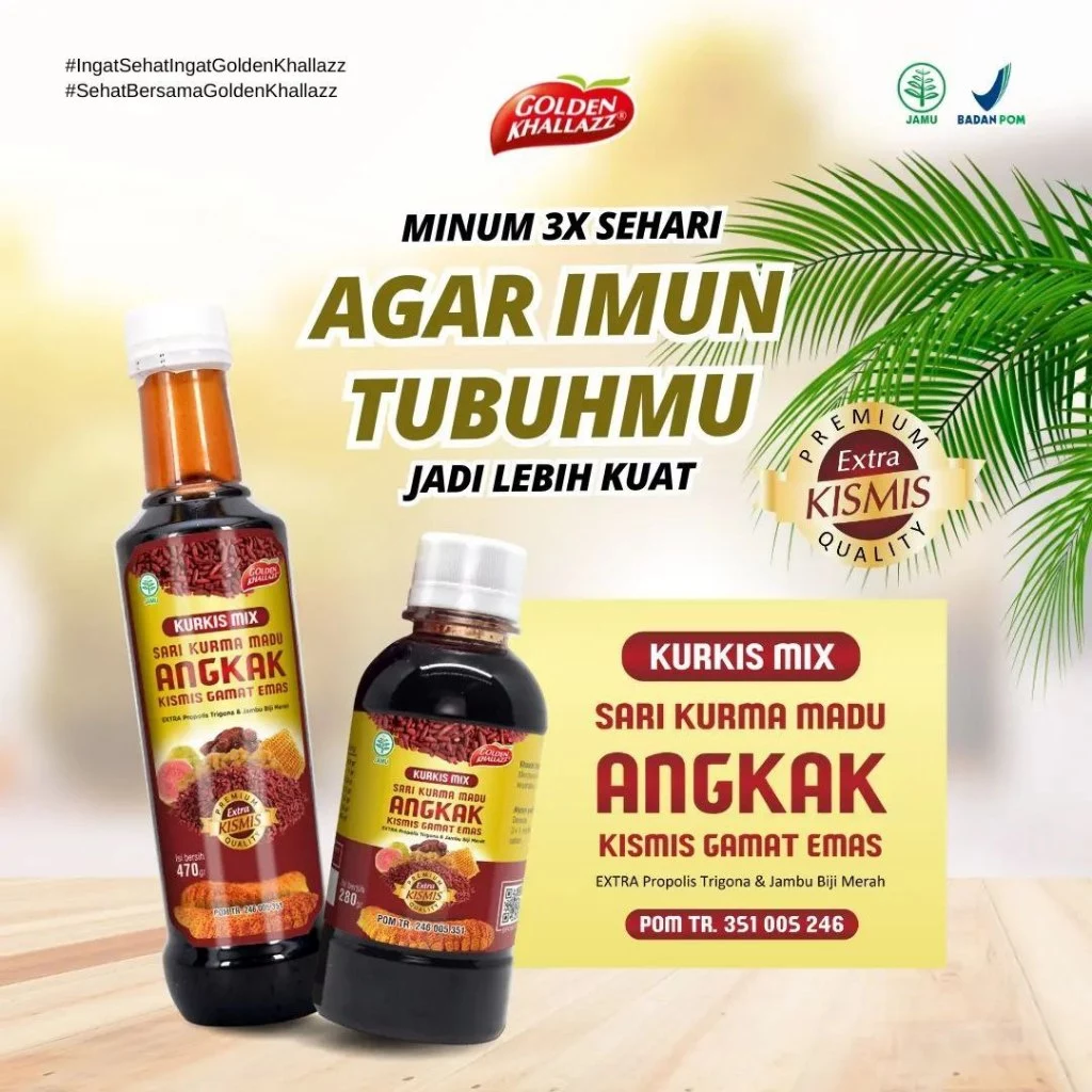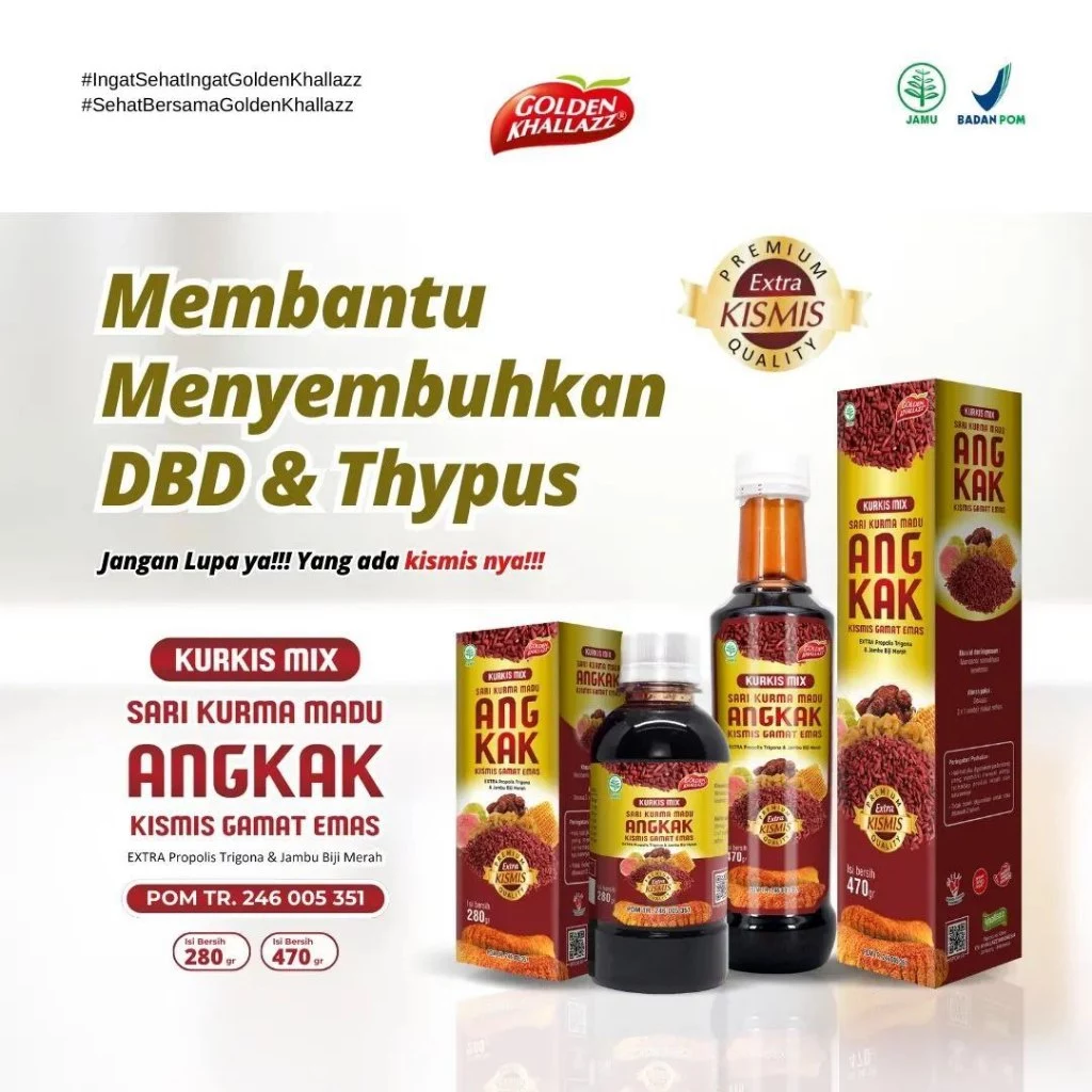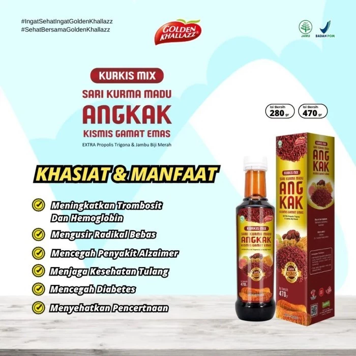 SARI KURMA MADU ANGKAK GOLDEN KHALLAZZ adalah Sarikurma yang diformulasikan dengan berbagai macam herbal pilihan sehingga bermanfaat untuk memelihara kesehatan, meningkatkan imunitas ,suplemen menambah darah, Hb dan trombosit ,diantaranya *Madu Murni* berkualitas dari nektar Habbatussauda’ mesir , *Ang-kak* merupakan ramuan tradisional Cina berupa hasil fermentasi dari jenis beras tertentu menggunakan ragi Manascus Sp ,Angkak terkenal sebagai obat herbal alami untuk penyembuhan penyakit Demam Berdarah (DB) ,Pigmen angkak berwarna merah yang menjadikan pemicu untuk meningkatkan kadar trombosit darah , *Propolis trigona* dari jenis lebah apis trigona yang dikenal sebagai lebah spesialis penghasil propolis ,dan *Sari jambu biji merah* yang secara empiris juga terbukti berkhasiat untuk membantu meingkatkan trombosit terutama pada pasien Demam berdarah.