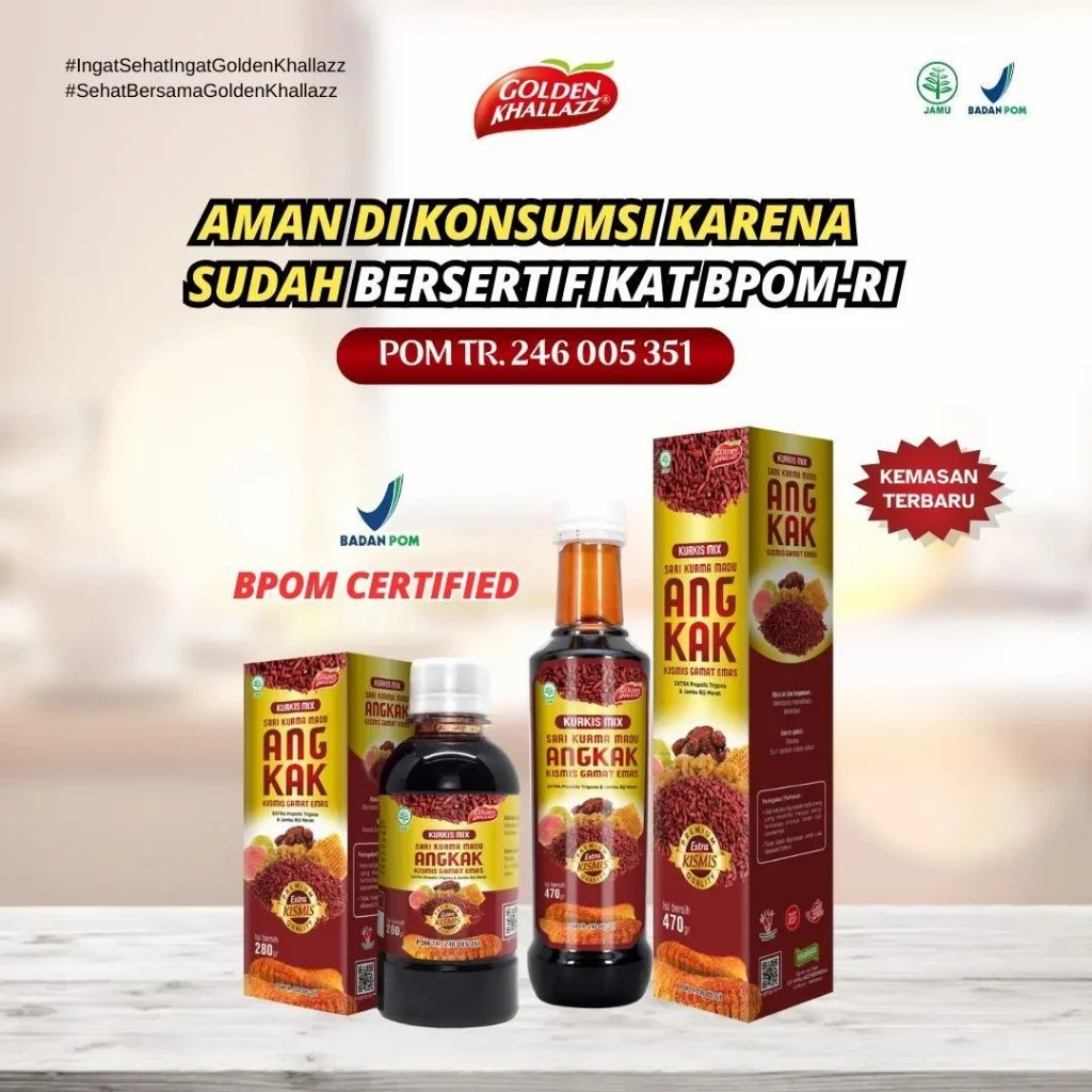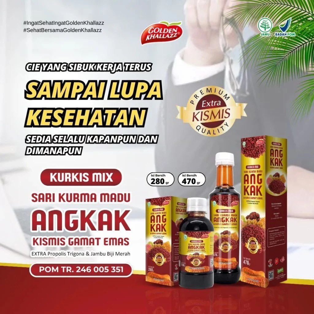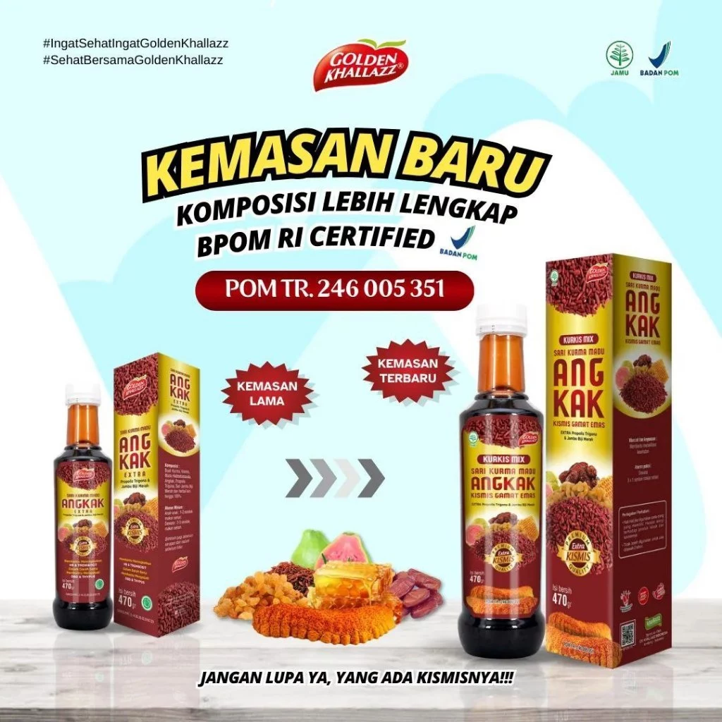 SARI KURMA MADU ANGKAK GOLDEN KHALLAZZ adalah Sarikurma yang diformulasikan dengan berbagai macam herbal pilihan sehingga bermanfaat untuk memelihara kesehatan, meningkatkan imunitas ,suplemen menambah darah, Hb dan trombosit ,diantaranya *Madu Murni* berkualitas dari nektar Habbatussauda’ mesir , *Ang-kak* merupakan ramuan tradisional Cina berupa hasil fermentasi dari jenis beras tertentu menggunakan ragi Manascus Sp ,Angkak terkenal sebagai obat herbal alami untuk penyembuhan penyakit Demam Berdarah (DB) ,Pigmen angkak berwarna merah yang menjadikan pemicu untuk meningkatkan kadar trombosit darah , *Propolis trigona* dari jenis lebah apis trigona yang dikenal sebagai lebah spesialis penghasil propolis ,dan *Sari jambu biji merah* yang secara empiris juga terbukti berkhasiat untuk membantu meingkatkan trombosit terutama pada pasien Demam berdarah.